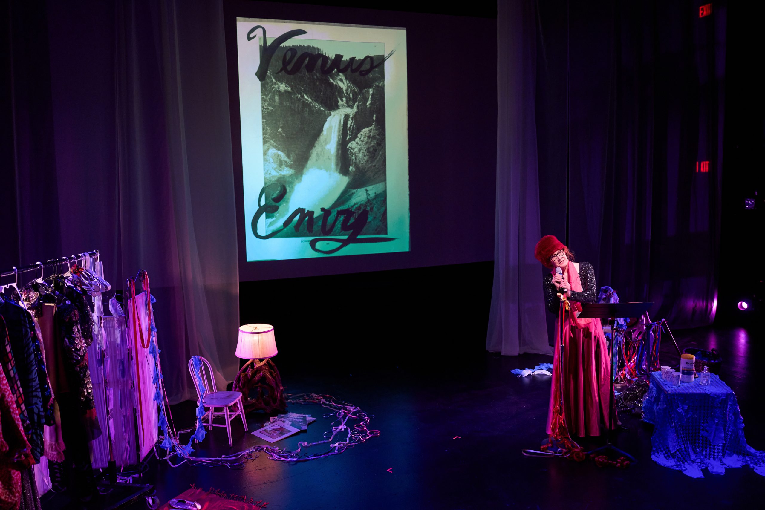 Karen Finley performs COVID Vortex Anxiety Opera Kitty Kaleidoscope Disco at Lenfest Center. Photograph by Rob David.